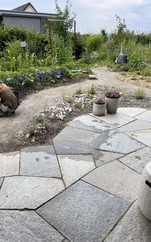 Gemeinsam mit der Kundin haben wir in mehreren Gesprächen eine Gartenplanung erstellt, in welcher sich die ganze Familie, die Nachbarschaft und Tiere wohl fühlen. Entstanden ist ein Garten mit Struktur und Charakter. Mit Sand abgestreute Kieswege führen durch eine Landschaft von Blütenstauden, Gemüsebeeten und Ruderalflächen. Ein Terrassenplatz aus einem charaktervollen Luserna-Naturstein, welchen wir polygonal verlegt haben, bietet der Familie einen Ort zum Verweilen und Genießen.